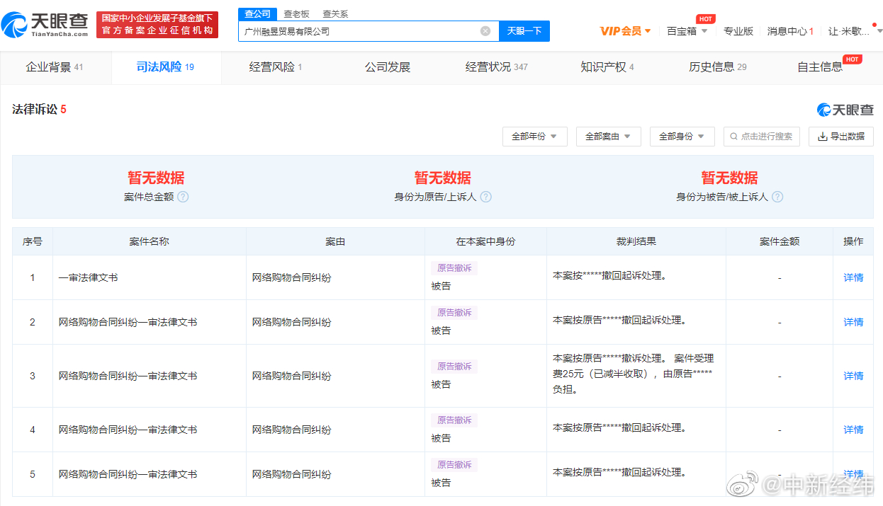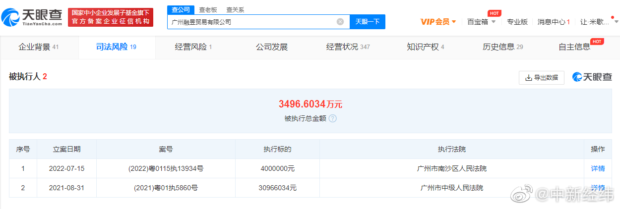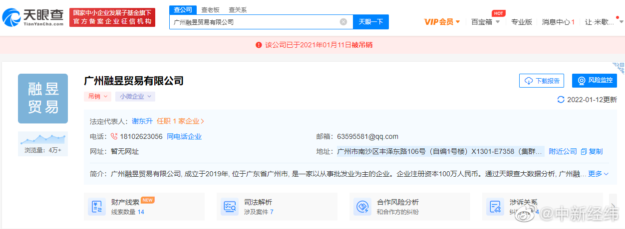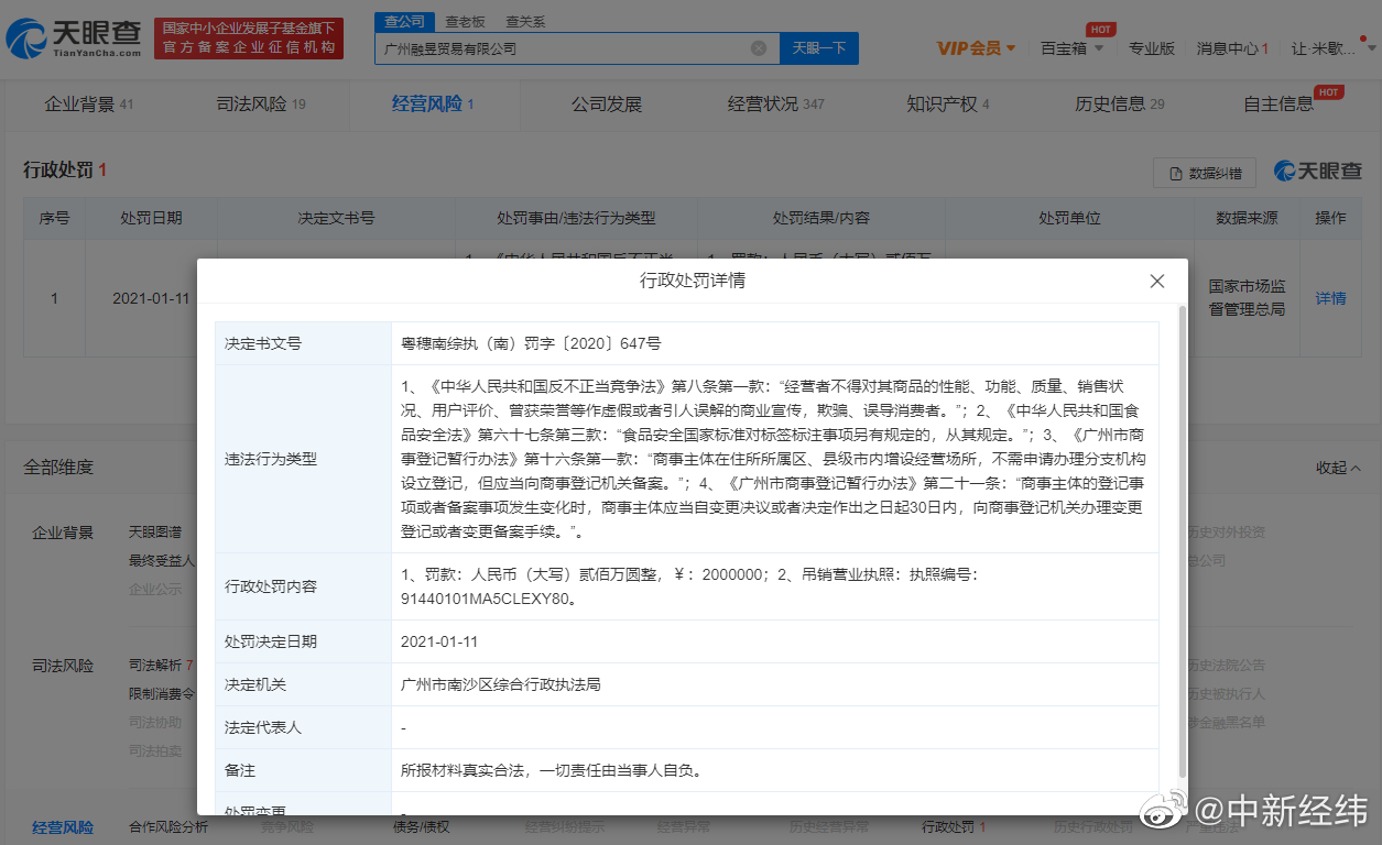 天眼查App显示,“假燕窝事件”涉事品牌方为广州融昱贸易有限公司。该公司成立于2019年1月,行政处罚信息显示,该公司因虚假宣传、涉案产品标签存在瑕疵等,于2021年1月被罚款200万并吊销营业执照。风险信息还显示,该公司存在2条被执行人信息和1条限制消费令,被执行总金额超3496万元。同时,该公司还存在多次因网络购物合同纠纷被起诉。