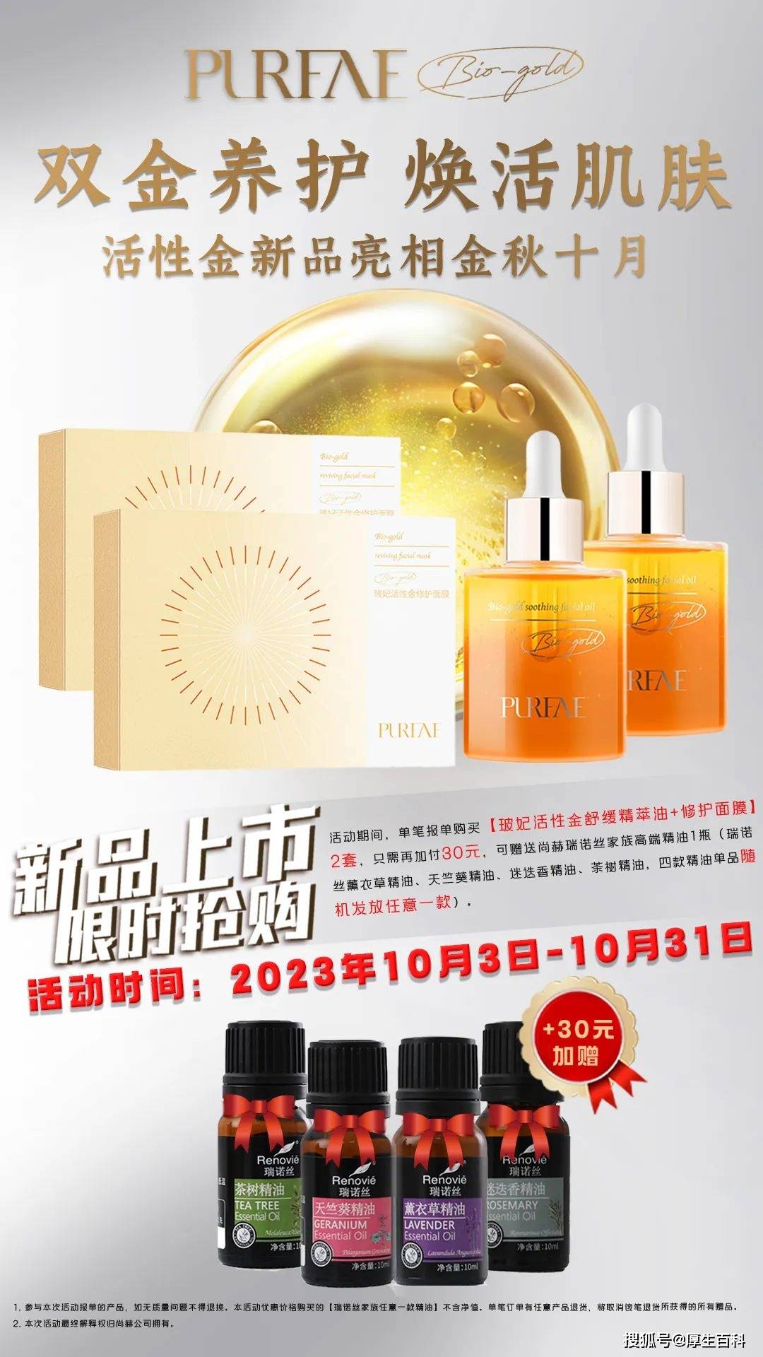 活动内容:活动期间,单笔报单购买【玻妃活性金舒缓精萃油+修护面膜】2套,只需再加付30元,好可赠送尚赫瑞诺丝家族高端精油1瓶(瑞诺丝薰衣草精油、天竺葵精油、迷迭香精油、茶树精油,四款精油单品随机发放任意一款)。