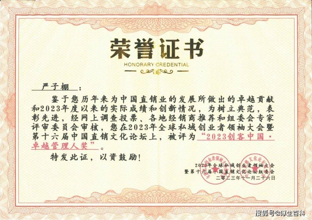 2023年11月25-26日,“2023年全球私域创业者领袖大会暨第十六届中国直销文化论坛”在北京举行。会上,理想华莱荣获“2023创业中国·受人尊敬企业奖”,理想华莱副总经理严子棚荣获“2023创业中国·卓越管理人奖”。