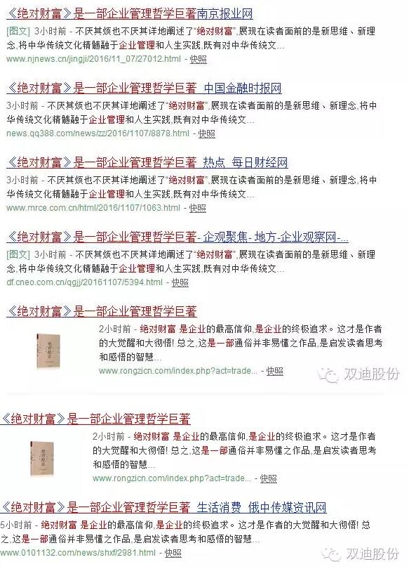 《绝对财富》其中不惜篇幅,对绝对财富进行了反复论证,全书二十五章一百二十节专门论述就有二十六节之多,如“吹响绝对财富的集合号”、“绝对财富的主体是人”、“绝对财富为谁而写”以及“绝对财富的意义”等等,作者说“真正的财富在哪里?在我们心里”,心有大未来,心有大财富,心里有就什么都有!并对绝对财富点明“绝对看似不可以动摇,实际它也是生动活泼的,它也处在不断变化中的,它也是辩证的——”最后,作者点明,“绝对财富”是企业的最高信仰,是企业的终极追求。这才是作者的大觉醒和大彻悟!