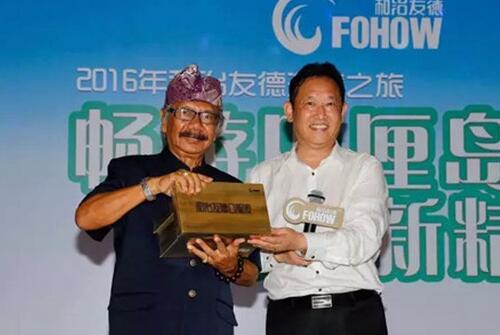 晚宴还邀请了印度尼西亚旅游促进会市场与发展部部长苏哎帝先生到场欢迎我们的菁英们,并与和治友德营销中心总经理杨宝忠先生互送礼品,促进两地经济与文化交流,分享快乐健康。
