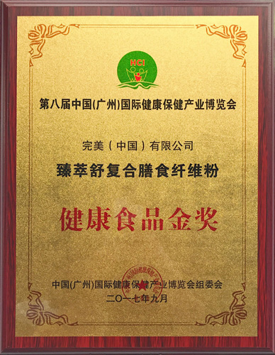完美公司新产品“臻萃舒复合膳食纤维粉”在众多的健康产品中脱颖而出,荣获第八届中国(广州)国际健康保健产业博览会颁发的“健康食品金奖”。