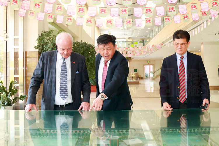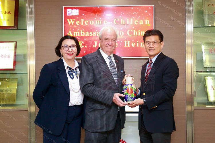 11月1日,智利驻华大使贺乔治莅临完美公司参观考察,完美公司总裁胡瑞连接待大使及其夫人一行,贺乔治对完美公司为促进中智两国民间商贸往来和友好情谊表示赞赏。