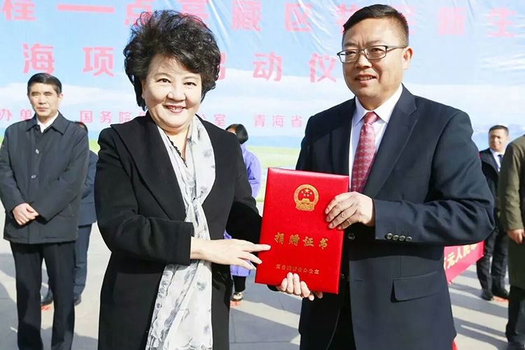 启动仪式上,杨永顺代表公司向青海省副省长杨逢春移交捐赠牌,并接受了国务院侨办主任裘援平颁发的捐赠证书。