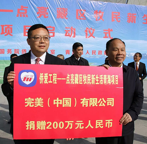 完美公司作为侨资企业,一直秉承“取之社会,用之社会”的公益理念,大力支持青海公益事业。2010年玉树地震发生后,完美公司为玉树灾区捐助善款1000万元用于灾区重建,此次更是心系青海藏区困难牧民,为“侨爱工程”捐赠200万元人民币。