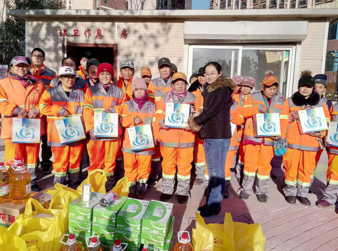 河北分公司党支部成员刘苏姣向环卫工人表达谢意,感谢他们兢兢业业、踏实工作,他们的辛勤劳动使城市变得更加优美,希望完美党支部赠送的物资能为他们带来温暖的关爱。