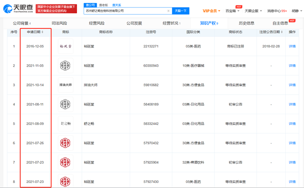 该公司注册了第03类日用化妆品“舒之畅”商标,商标状态为“等待实质审查”;第05类医药“裕延堂”商标则已于2018年2月28日注册;第10类医疗器械、第30类方便食品、第05类医药“裕延堂”商标,均处于“等待实质审查”阶段;第03类日化用品、第32类啤酒饮料“裕延堂”商标为“初审公告”;以及等待实质审查的第20类方便食品“排油大师”商标。