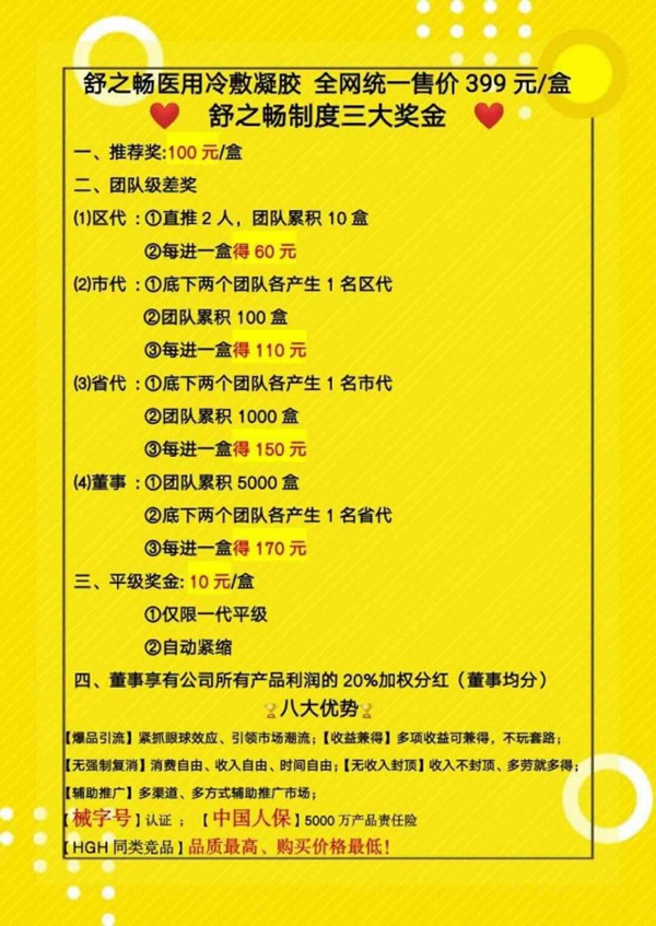 苏州健力设置的“舒之畅医用冷敷凝胶奖金制度”含有多个分销级别和多重返利、团队计酬条款,包括推荐奖100元/盒(舒之畅冷敷凝胶全球统一售价399元/盒)、团队级差奖(区代市代省代董事四级)、平级奖金等。