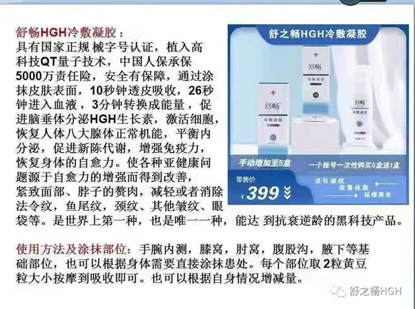 “舒之畅HGH”公众号则显示,“舒之畅HGH冷敷凝胶”为全球唯一一款不用注射、不用仪器、不用手术、不用口服,只要每天在家轻松涂抹,就能改善脸上皱纹、眼袋、皮肤松弛下垂,淡化各种色斑,痘坑痘印。