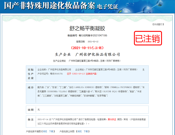 记者在国家药监局官网国产非特殊用途化妆品备案中查询到,“舒之畅平衡凝胶”备案编号为“粤G妆网备字2021047186”,备案日期为2021年03月12日,生产企业为广州佐伊化妆品有限公司。