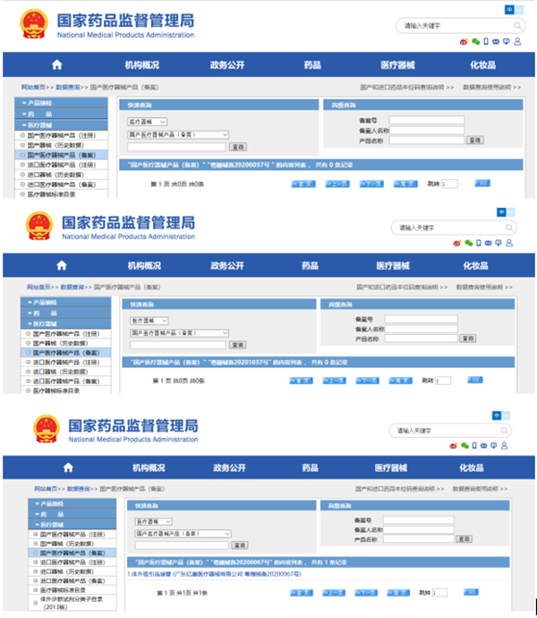 据国家药监局官网查询信息显示,“粤穗械备20200067号”的产品为广东亿康医疗器械有限公司的“体外吸引连接管”,而“粤穗械备20200057号”与“粤穗械备20201037号”则查无产品。