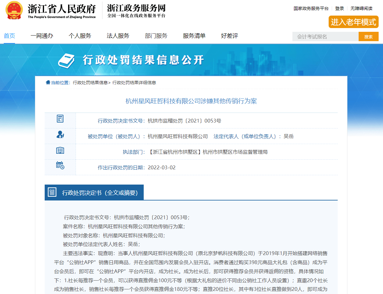 2022年3月,浙江省人民政府网发布的行政处罚决定书(杭拱市监稽处罚〔2021〕0053号)显示,杭州星风旺哲科技有限公司(原北京梦帆科技有限公司)于2019年1月开始搭建网络销售平台“公销社APP”销售日用商品,并在全国范围内发展会员入驻开店。消费者通过购买398元商品大礼包(含商品)成为平台会员后,即可在“公销社APP”平台内开店,成为社长。成为社长后,即可获得推荐会员并获得返佣的资格。