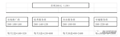以上是服务同级别每盒的额外培训津贴出多少盒就是盒数*上面的金额,额外津贴中的 16 -4(20元) 是有上个级别拨。按照首席举例:自己的直属5个首席,每个首席每天出200盒,200*5元*5人=5000元/天;做好复制5个首席再带出5个首席就是25个人,每个人出200盒,200*4元*25人= 20000元/天,5000+20000=2.5万/天。