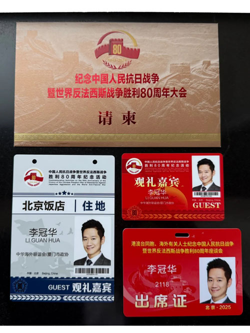 9月2-3日,受中共中央统战部邀请,中华海外联谊会理事、厦门市政协常委、福建省港区政协委员联谊会监事长、香港福建社团联会常务副主席、厦门市侨商联合会会长、金日集团总裁李冠华,赴京参加了港澳台同胞、海外有关人士纪念中国人民抗日战争暨世界反法西斯战争胜利80周年座谈会,作为观礼嘉宾参加了在天安门广场举办的盛大的阅兵仪式。